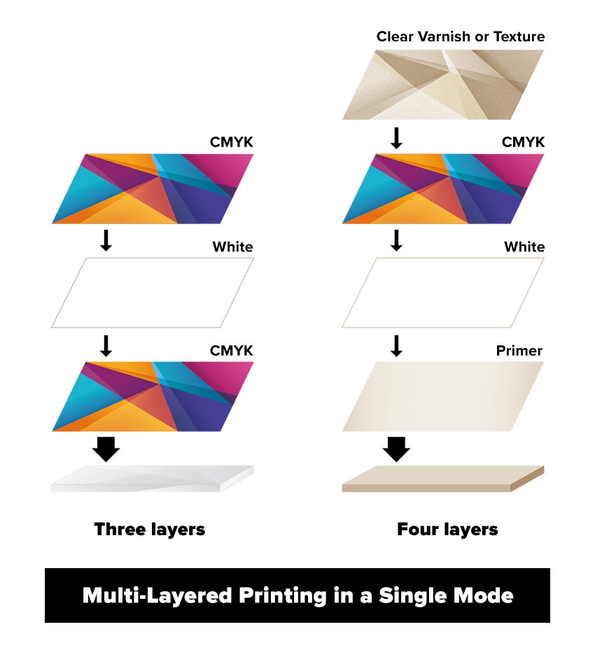 *4-laags printen (Primer-Wit-CMYK-Gloss) alleen beschikbaar als u bij de glanslaag matte lak gebruikt.